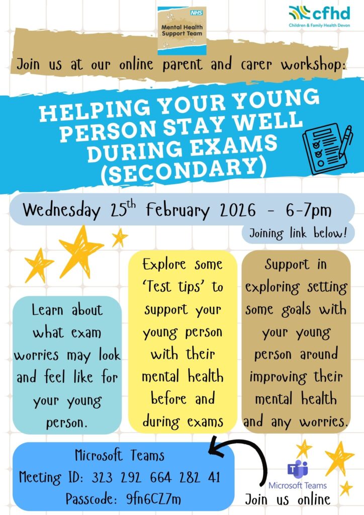 Our Mental Health Support Team in schools (MHST) is excited to announce that that they will be running a parents and carers exam stress workshop to help support young people.
