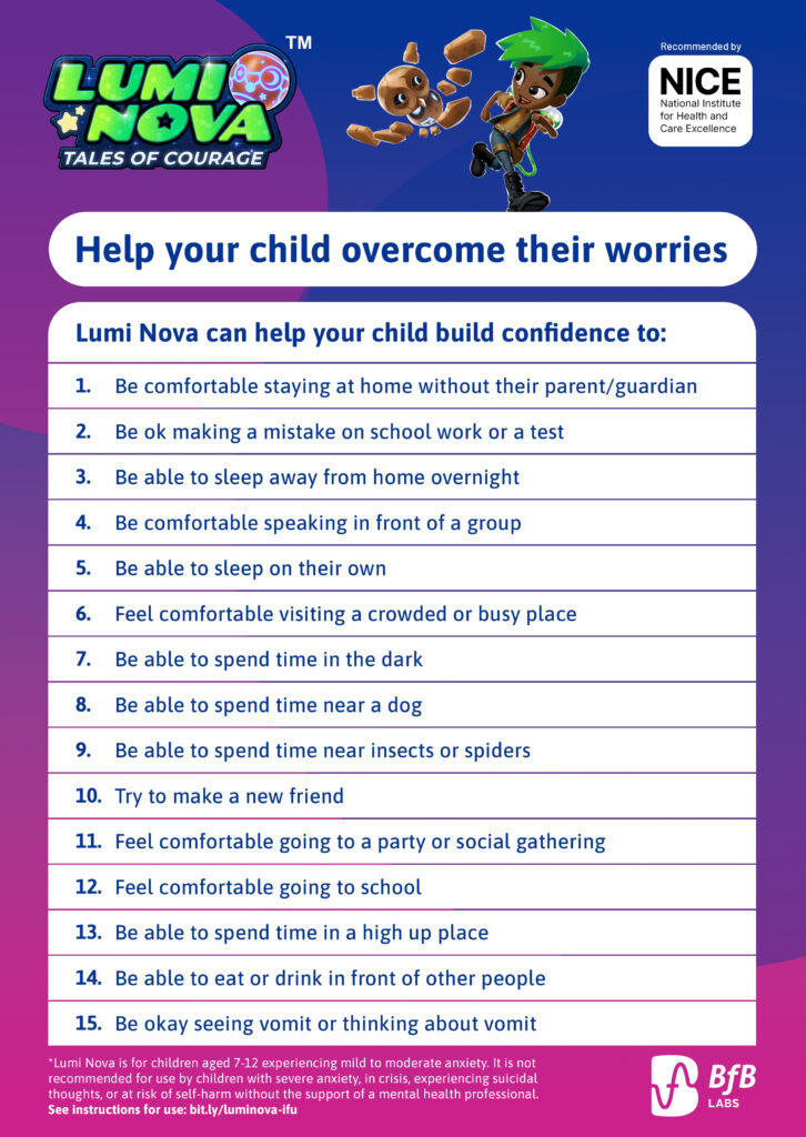 Lumi Nova is for children aged 7-12 years old experiencing mild to moderate anxiety, such as: