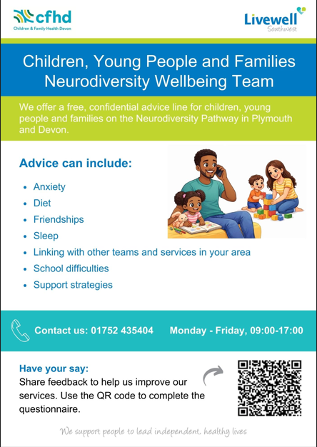 Livewell and CFHD are working together to provide a free, confidential advice line for children, young people and their families on the Neurodiversity Pathways in Plymouth and Devon.